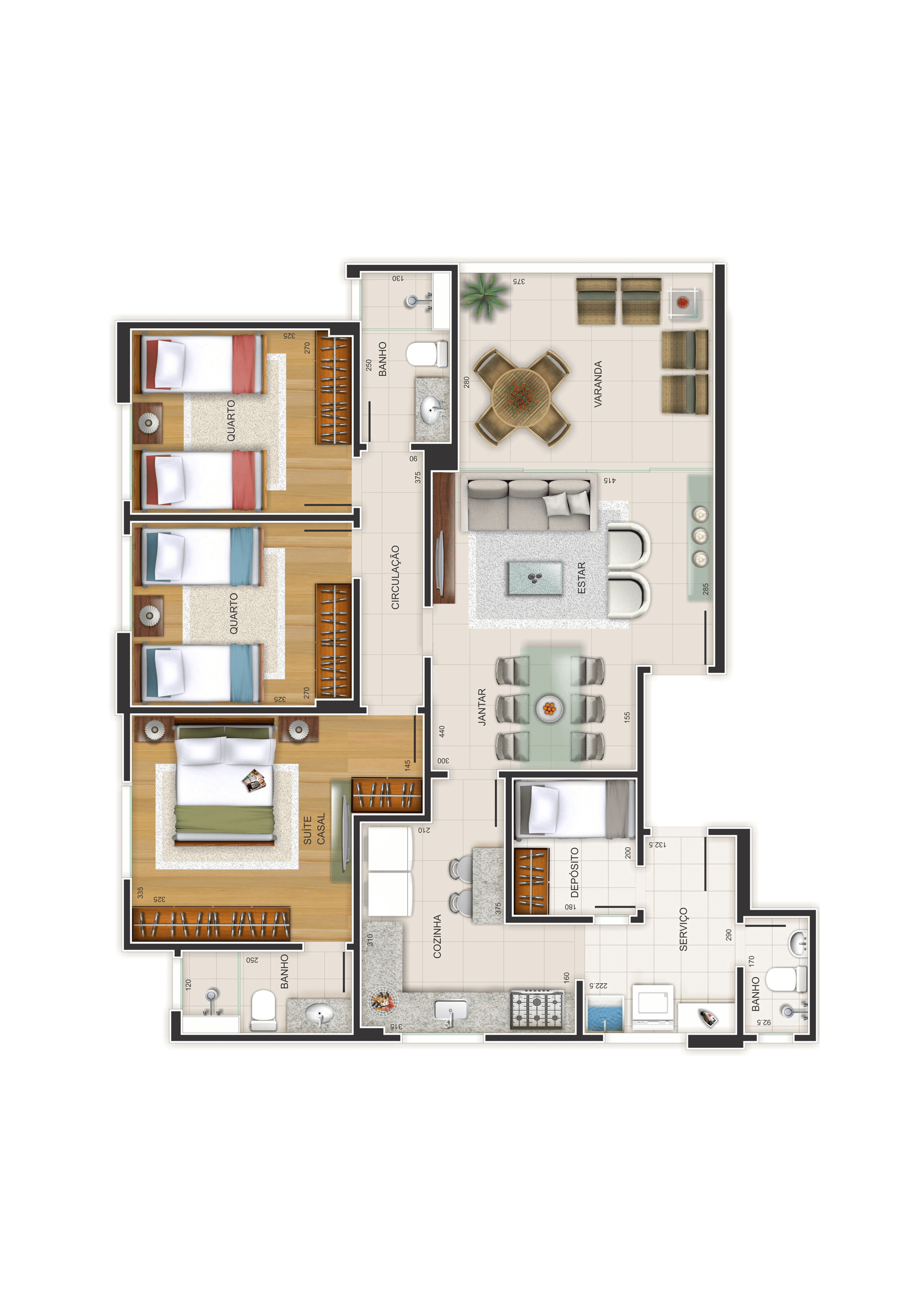 de 3 quartos, projetados com