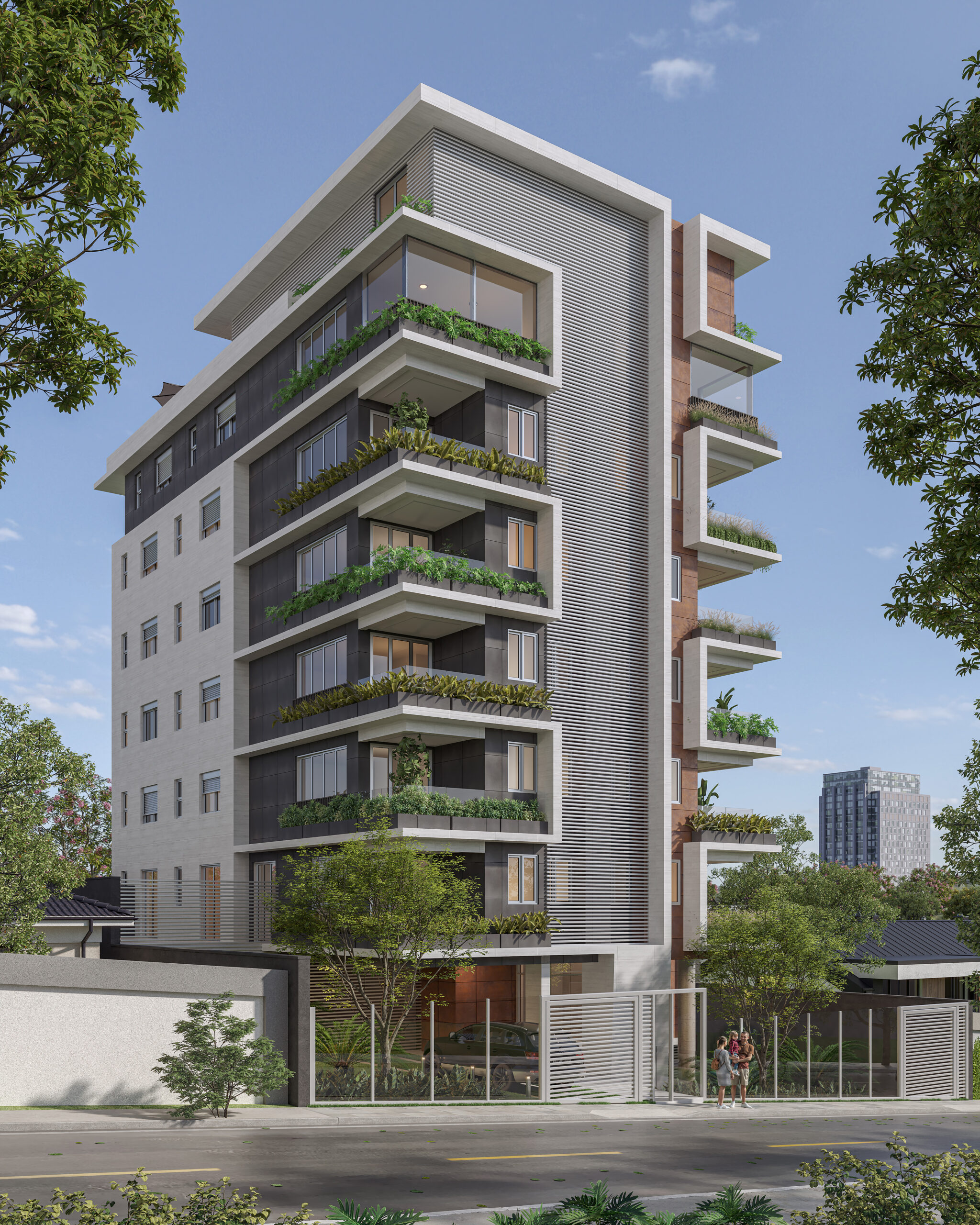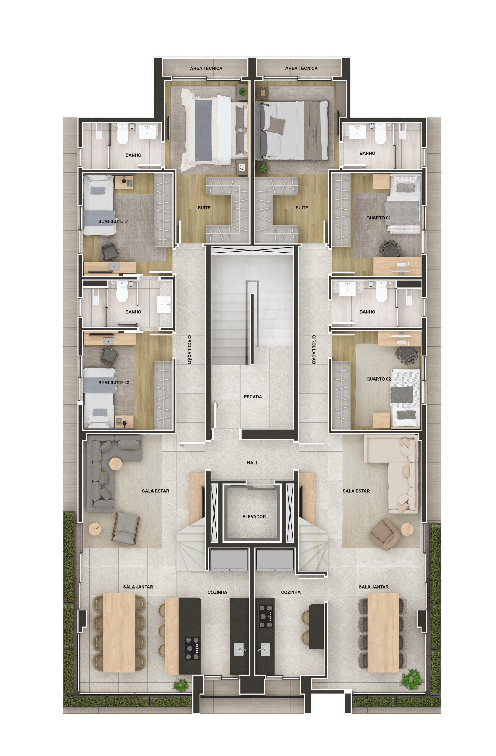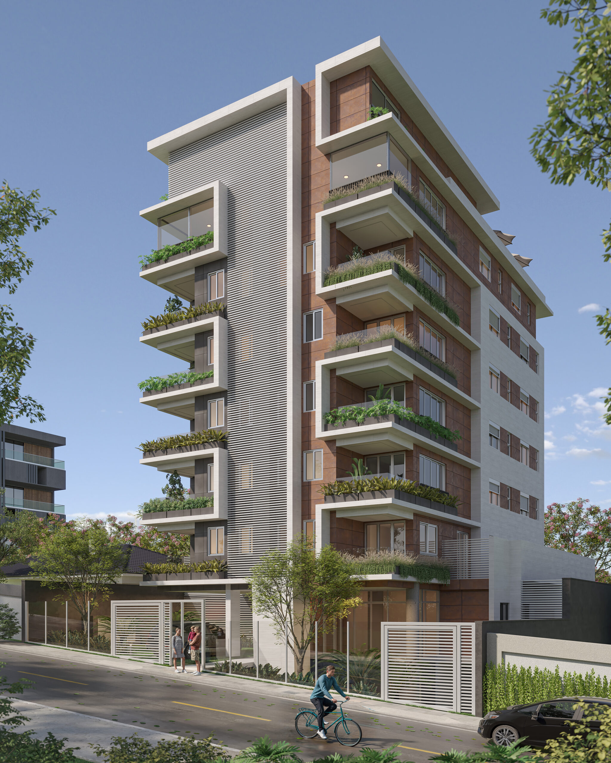 São 2 coberturas, duas áreas privativas e 8 apartamentos tipo. Materiais superiores e uma fachada imponente, que te deseja boas vindas com presença e sofisticação.