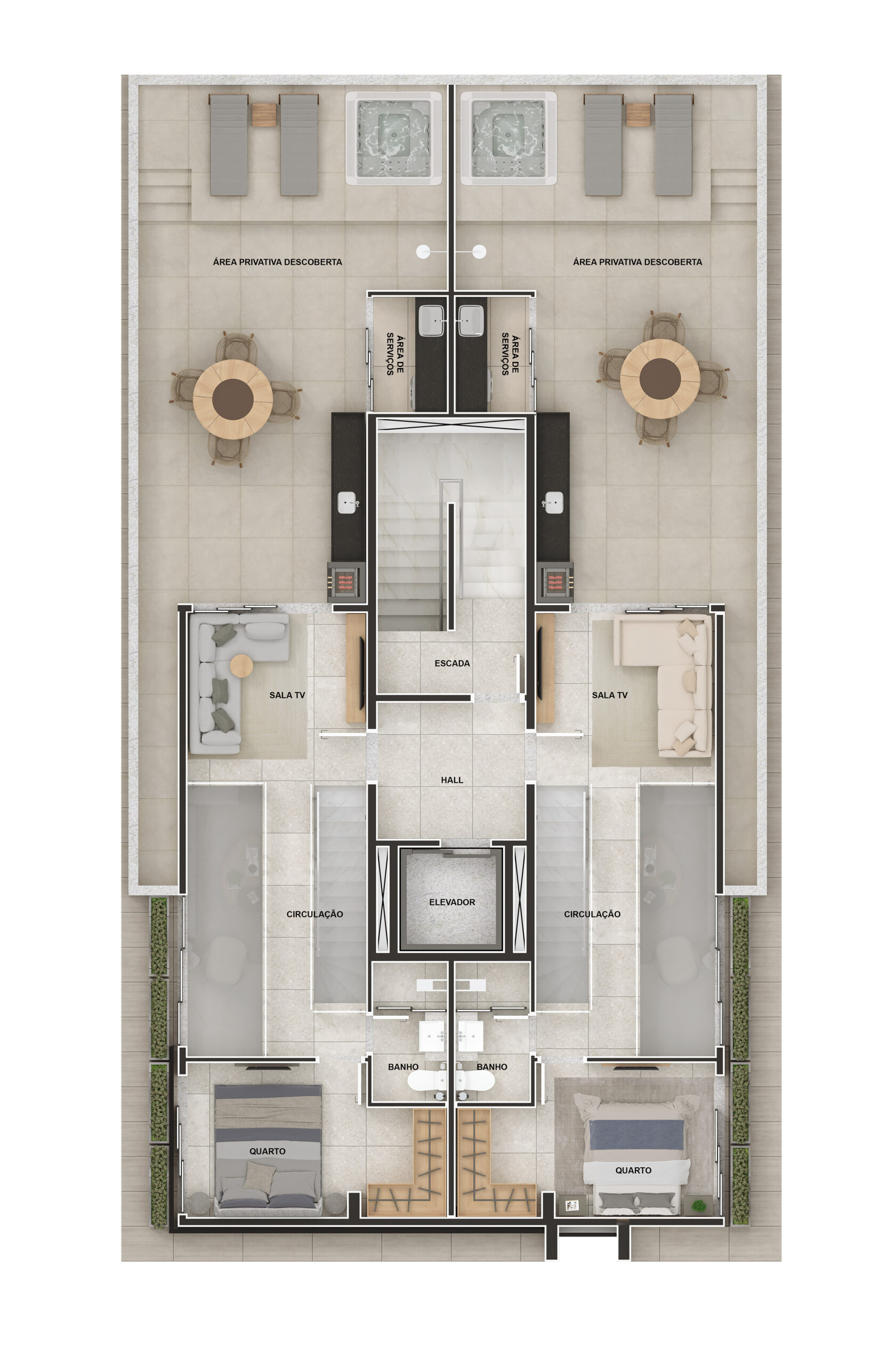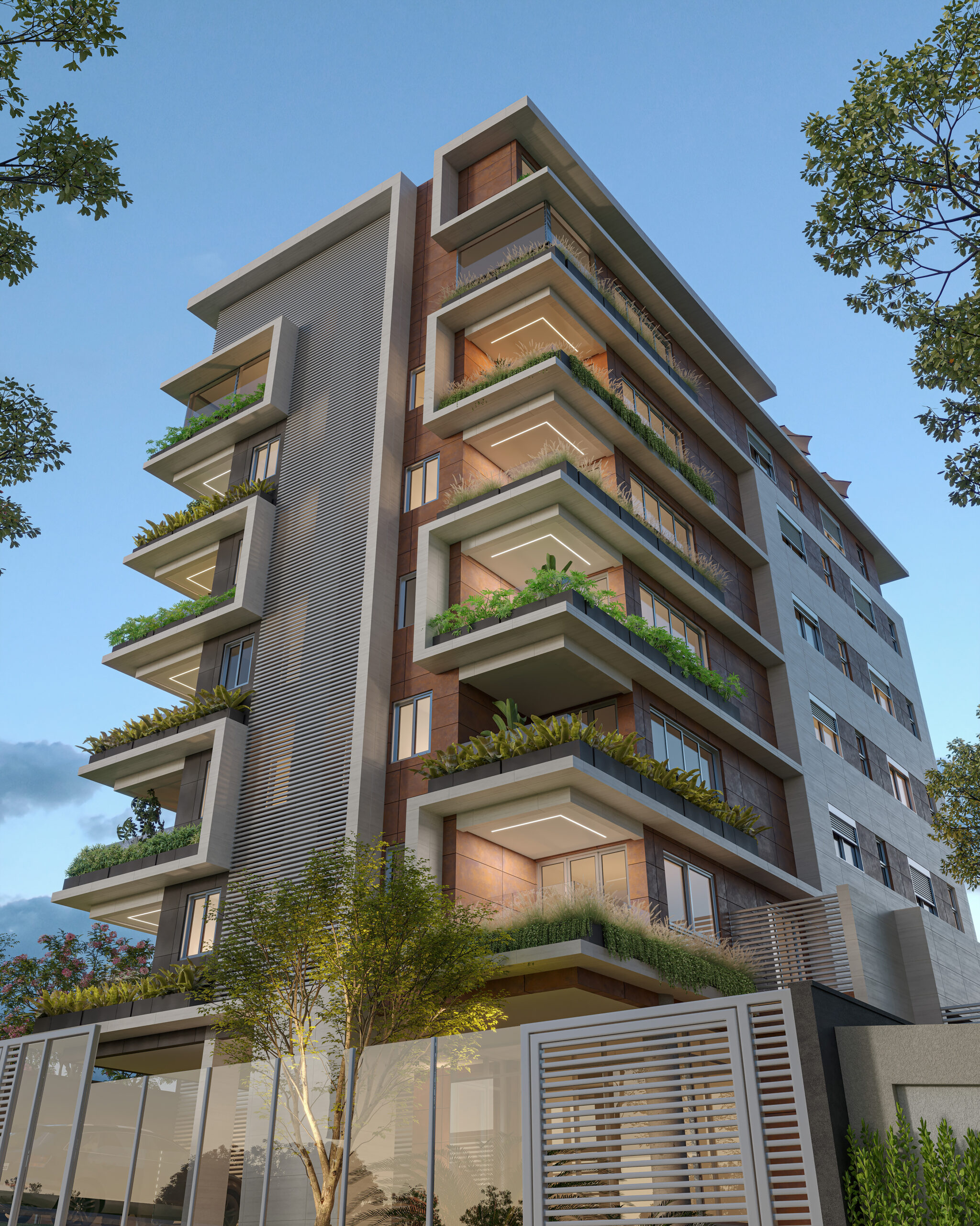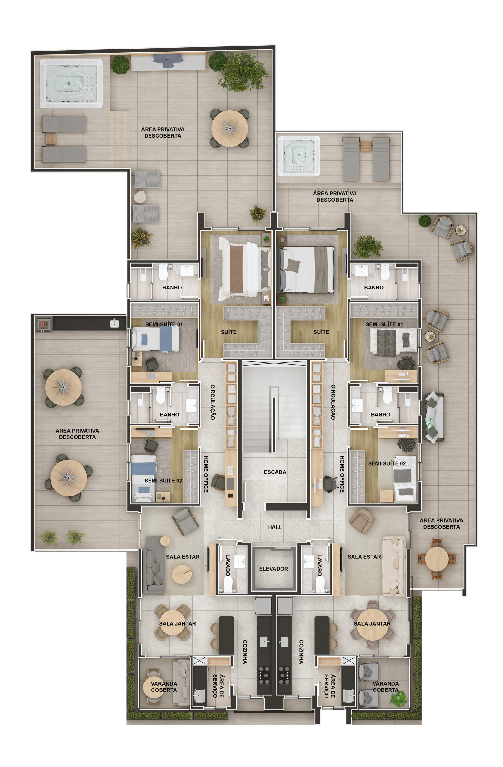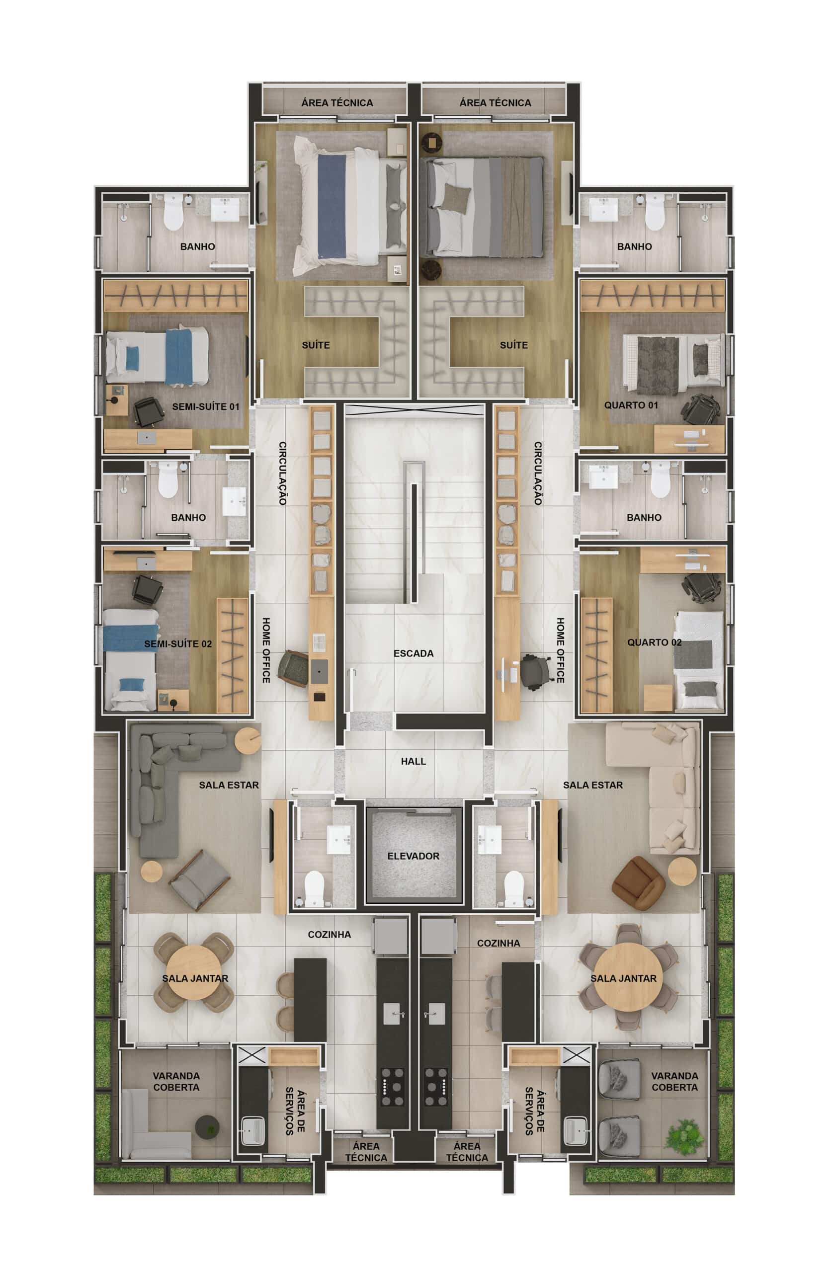 São 2 coberturas, duas áreas privativas e 8 apartamentos tipo. Materiais superiores e uma fachada imponente, que te deseja boas vindas com presença e sofisticação.